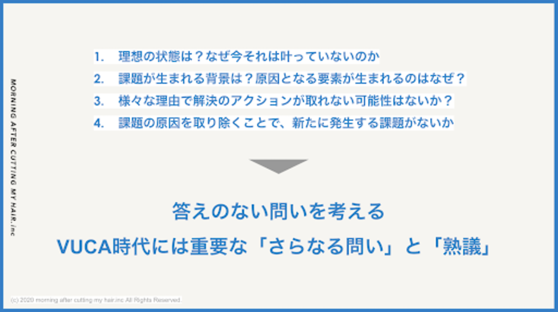 ・通常所要時間よりも絞った形での実施となりましたが、とても満足の行くレベルで、その後のワークにもみんな活かせていると思っています。